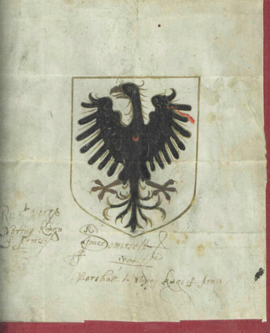 In the 1584 Visitation by Robert Glover a copy of the Arms was recorded and signed by "Robert Glover alias Somersett, herald at Armes, Marshall and deputie to William flower, Esquier, alias Norroy, kinge of Armes and principall herald of the East West and North partes of ye realme of Englande from ye Trent Northwarde"